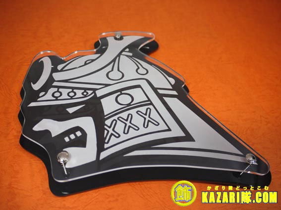 2枚重ねのデラックスプレート(飾り台)です。 上板は、航空自衛隊部隊マークのデザインを透明な板に、KAZARI隊.COM 飾人(=しょくにん)が薄彫りしています。 下板は、黒色の板を上板より全体にやや大きく切り出しています。 下板の黒い板には、お客様のお好みの演出で、色加工等(例として、空の写真など貼る。和紙など貼る。等)をしていただければ、 より一層、雰囲気のあるプレート(飾り台)に仕上がることまちがいなしです!! もちろんそのままでも上板のモチーフが黒い板に映り込んで迫力ある飾り方ができます。 組ネジとスペーサーで航空自衛隊部隊マーク(上板)と黒色の板(下板)を1cmのスペース(高さ)を設けることにより、 プレート(飾り台)に立体的な高級感をもたせました。お客様の大切な空間を最高級かつ豪華に飾っていただくことができる一品です。 板の材質は高級アクリルを使用しております。 インテリアの一部としてお楽しみください。また、1/72 航空自衛隊戦闘機模型のディスプレーにご使用いただける飾り台です。 お手軽に作品の迫力を増し、高級感を演出することができます。もちろん、お客様の工夫次第で他のスケールへの流用も可能です。 <第3飛行隊> 三沢基地をベースとする対空支援部隊。2001年に支援戦闘機「F-1」から「F-2」へ機種更新されました。 部隊マークは「兜武者」