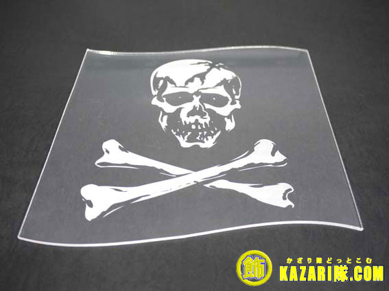透明な板に、ジョリーロジャース部隊マークで有名なドクロマークのデザインを、 KAZARI隊.COM 職人(飾人=しょくにん)が薄彫りしています。 お客様のお好みの演出で、板の下面に色加工等(例として、空の写真など貼る。和紙など貼る。等)をしていただければ、 より一層、雰囲気のある模型作品に仕上がることまちがいなしです!! もちろんそのままでも迫力ある飾り方ができます。 お客様の航空模型を高級かつ豪華に飾っていただくことができる一品です。 板の材質は高級アクリルを使用しております。
